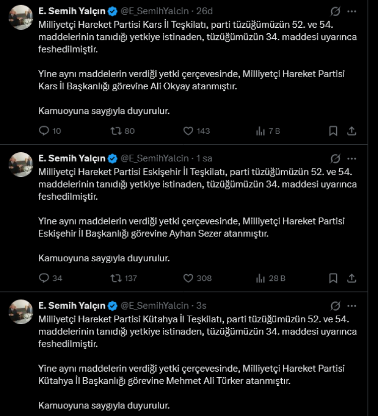MHP Genel Başkan Yardımcısı E. Semih Yalçın, Kütahya, Eskişehir ve Kars il teşkilatlarının feshedildiğini, üç ile yeni başkan atandığını duyurdu.