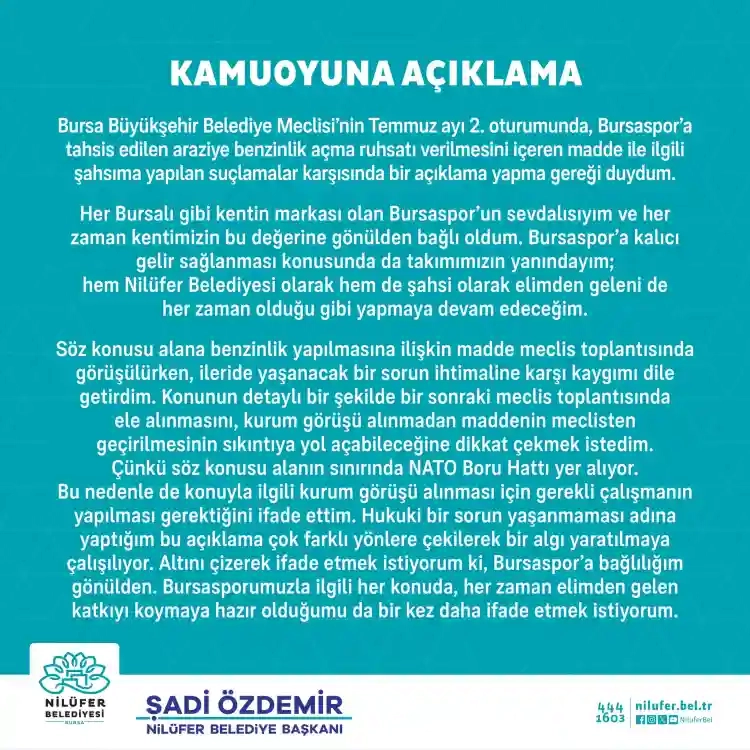 "Bursa Büyükşehir Belediye Meclisi‘nin Temmuz ayı 2. oturumunda, Bursaspor’a tahsis edilen araziye benzinlik açma ruhsatı verilmesini içeren madde ile ilgili şahsıma yapılan suçlamalar karşısında bir açıklama yapma gereği duydum. Her Bursalı gibi kentin markası olan Bursaspor’un sevdalısıyım ve her zaman kentimizin bu değerine gönülden bağlı oldum. Bursaspor’a kalıcı gelir sağlanması konusunda da takımımızın yanındayım; hem Nilüfer Belediyesi olarak hem de şahsi olarak elimden geleni de her zaman olduğu gibi yapmaya devam edeceğim. Söz konusu alana benzinlik yapılmasına ilişkin madde meclis toplantısında görüşülürken, ileride yaşanacak bir sorun ihtimaline karşı kaygımı dile getirdim. Konunun detaylı bir şekilde bir sonraki meclis toplantısında ele alınmasını, kurum görüşü alınmadan maddenin meclisten geçirilmesinin sıkıntıya yol açabileceğine dikkat çekmek istedim. Çünkü söz konusu alanın sınırında NATO Boru Hattı yer alıyor. Bu nedenle de konuyla ilgili kurum görüşü alınması için gerekli çalışmanın yapılması gerektiğini ifade ettim. Hukuki bir sorun yaşanmaması adına yaptığım bu açıklama çok farklı yönlere çekilerek bir algı yaratılmaya çalışılıyor. Altını çizerek ifade etmek istiyorum ki, Bursaspor’a bağlılığım gönülden. Bursasporumuzla ilgili her konuda, her zaman elimden gelen katkıyı koymaya hazır olduğumu da bir kez daha ifade etmek istiyorum."