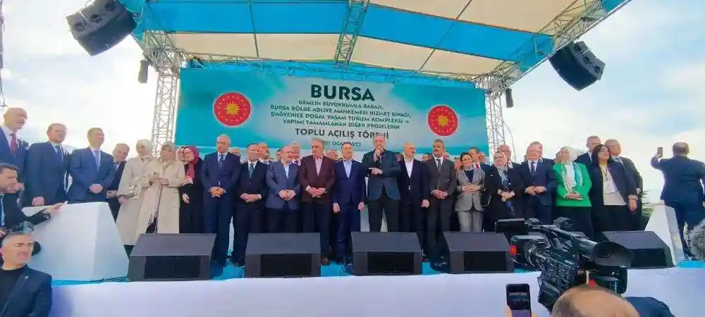 Erdoğan kuraklık meselesine de değinerek, “Kuraklık var. Soruyorlar, çare ne? Çare işte bizim de yaptığımız gibi baraj inşa etmek. Eğer bu barajlarınız olmazsa kuraklıkla mücadele edemezsiniz. TOKİ’nin Dursunbey’in Karyağmaz Köyü’nün MustafaKemalPaşa’ya nakletmesi için yaptığı 404 konut, 100 ahırın, Orhangazi 292 konut, Orhaneli 148 konutun, Gemlik’te tamamlanan 224 konutun dönüşümünün resmi açılışını da bugün burada yapıyoruz. Tarım Bakanlığı’mızın çeşitli birimleri tarafından tamamlanan destekleme projelerinin, hizmet binalarının, restorasyonların resmi açılışlarını buradan gerçekleştiriyoruz. Bursa Büyükşehir Belediye’miz güncel değeri 4,6 milyar lirayı geçen 67 ayrı projeyi Bursa’mıza kazandırdı. Aralarında Dağyenice Doğal Yaşam Merkezi, Gökdere Millet Bahçesi’nin çok sayıda yol yapımı, spor tesisi inşaatı, otopark, çevre düzenlemesi, araç alımı, arıtma tesisinin de bulunduğu bu yatırımların resmi açılışını da buradan yapıyoruz. Aynı şekilde ilçe belediyelerimizin tamamlanan yatırımlarını da resmen hizmete açıyoruz. Özel sektörümüzce şehrimize kazandırılan 30 milyar lirayı bulan 19 bin istihdam sağlayacak 128 tesisin de resmi açılışlarını gerçekleştiriyoruz. Toplam yatırım tutarı güncel rakamla 12 milyar liraya varan kamu yatırımları şehrimize hayırlı olsun” diye konuştu.