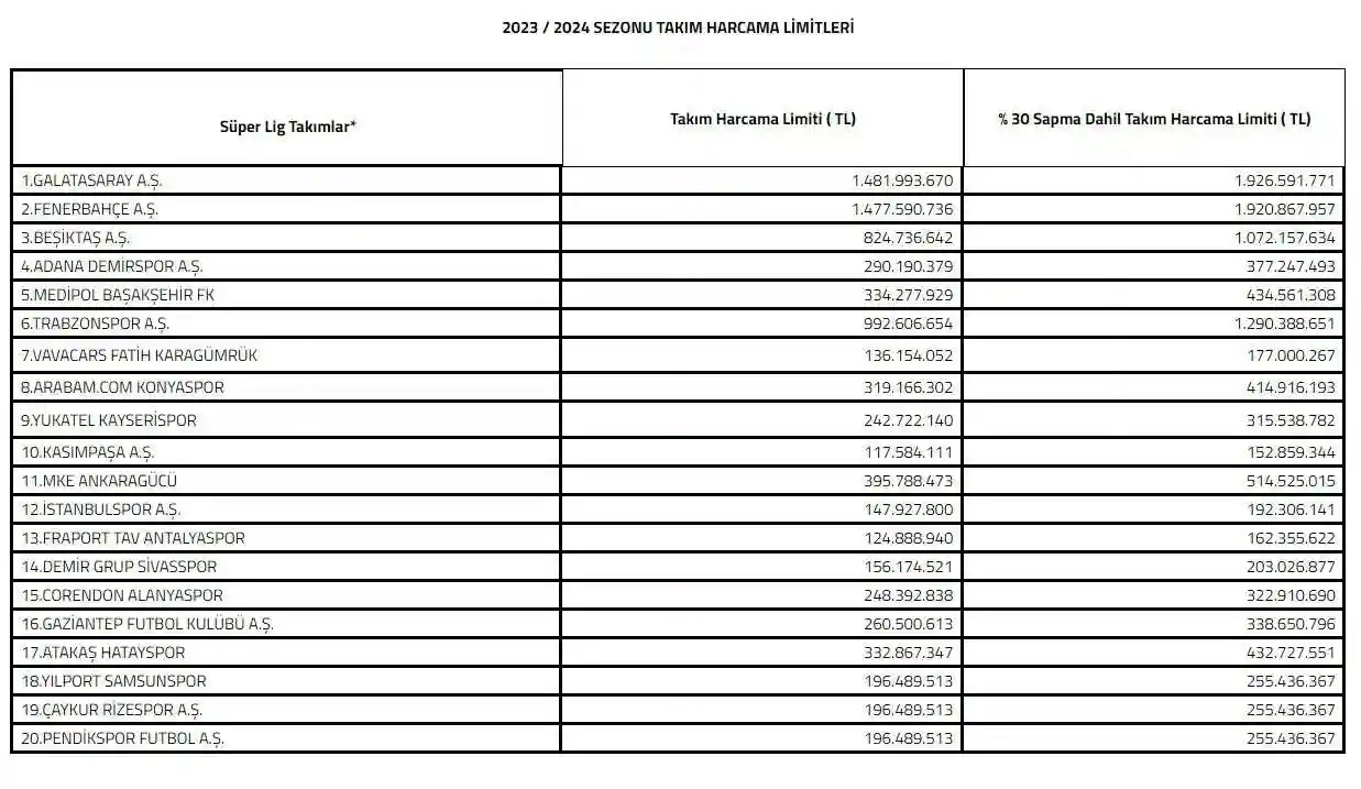 Türkiye Futbol Federasyonu Kulüp Lisans Kurulu, Kulüp Lisans ve Finansal Sürdürülebilirlik Talimatı'nın 121. maddesi kapsamında Süper Lig kulüplerinin 2023-2024 sezonu harcama limitlerini belirledi. Buna göre kurul; geçen sezonu şampiyon olarak tamamlayan Galatasaray için yüzde 30 sapma dahil 1 milyar 926 milyon milyon TL, ikinci Fenerbahçe'ye 1 milyar 920 milyon TL, üçüncü Beşiktaş'a ise 1 milyar 72 milyon TL harcama limiti verdi.