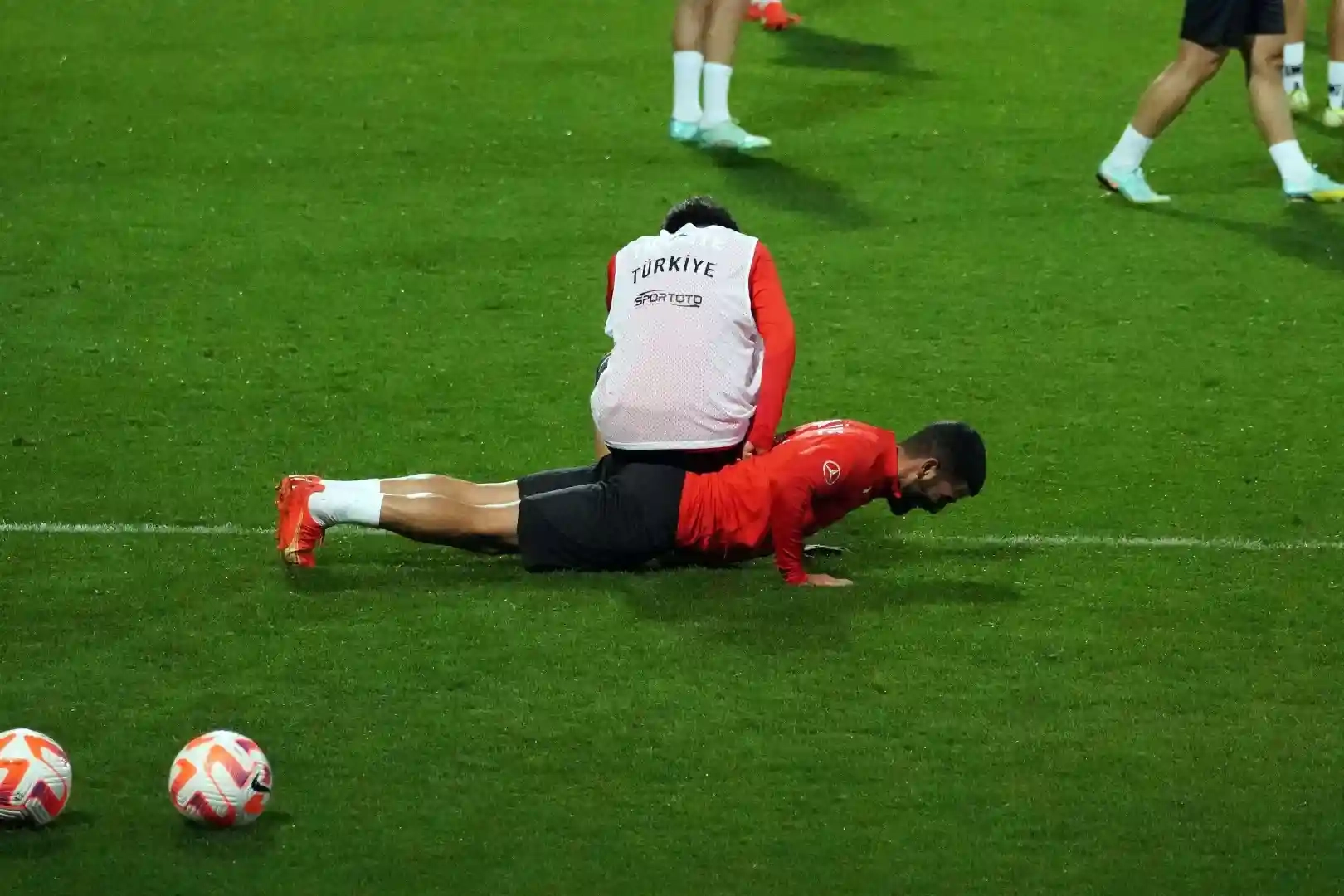 Dünya Kupası arasında İskoçya ve Çekya ile hazırlık maçlarında karşı karşıya gelecek olan A Milli Takım, bu karşılaşmaların idmanlarına başladı. Riva Hasan Doğan Milli Takımlar Kamp ve Eğitim Tesisleri’nde toplanan ve ilk antrenmanını burada gerçekleştiren milliler, Teknik Direktör Stefan Kuntz önderliğinde ilk bölümü basına açık olarak çalıştı. İdman öncesinde Kuntz ve Cenk Tosun yaklaşık 5 dakika sohbet etti. Antrenman ısınma hareketleriyle başladı. Ardından 3 takım halinde geniş alanda top kapma ve pas idmanı yapıldı. Kaybeden takım şınav çekme cezası alırken, Arda Güler, şınav çeken Umut Bozok’un üzerine oturdu. Antrenmanda keyifli görüntüler ortaya çıktı. Çalışmanın basına kapalı bölümünde ise taktik idman yapıldı. Yarın saat 14.30’da özel uçakla Diyarbakır’a gidecek olan millilerde Teknik Direktör Stefan Kuntz ve bir futbolcu, 18.15’te basın toplantısında soruları yanıtlayacak. Milliler, İskoçya maçının hazırlıklarını ise saat 19.00’da maçın oynanacağı statta yapacağı idmanla tamamlayacak.