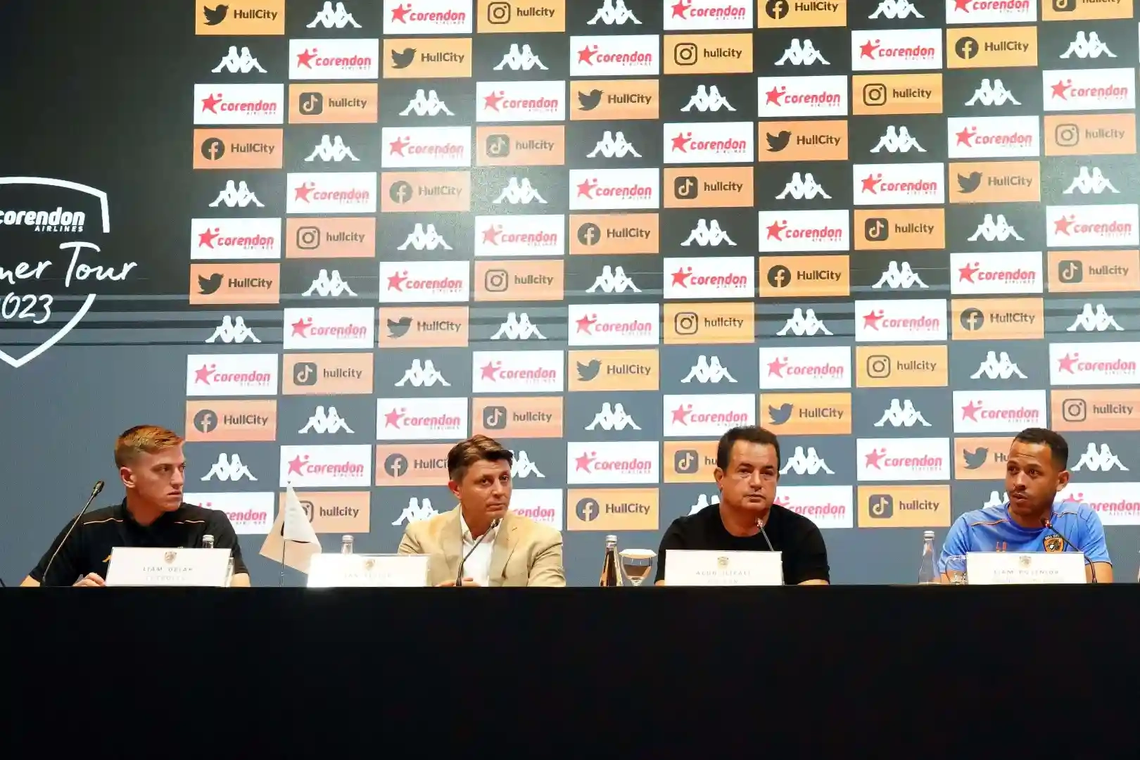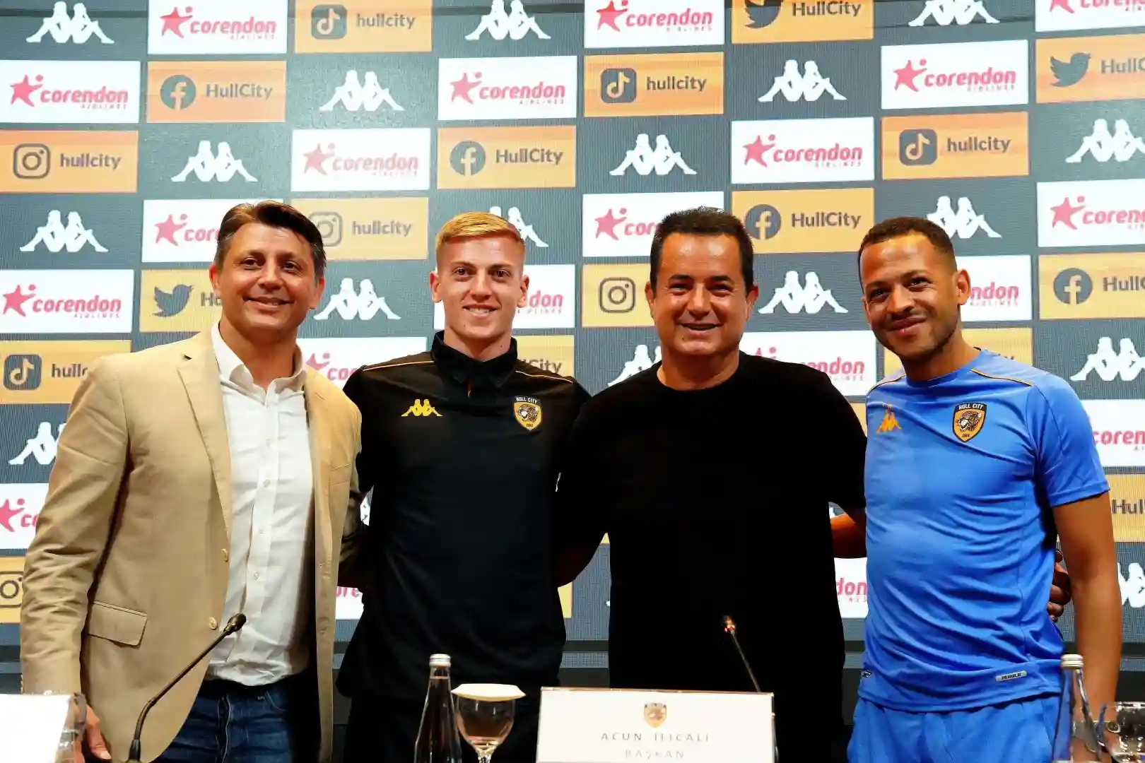İngiltere Championship takımlarından Hull City’nin ‘Corendon Summer Tour 2023’ kapsamında Galatasaray ve Hatayspor ile oynayacağı dostluk maçları öncesinde Hull City Başkanı Acun Ilıcalı, Hull City Başkan Vekili Tan Kesler, Hull City Teknik Direktörü Liam Rosenior ve takımın yeni transferlerinden Liam Delap’ın katılımıyla Türkiye Futbol Federasyonu Riva Hasan Doğan Milli Takımlar Kamp ve Eğitim Tesisleri’nde basın toplantısı düzenlendi.