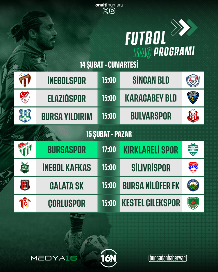 14 Şubat – Cumartesi 15:00 :İnegölspor – Sincan BLD 15:00 :Elazığspor – Karacabey BLD 15:00 :Bursa Yıldırım – Bulvarspor