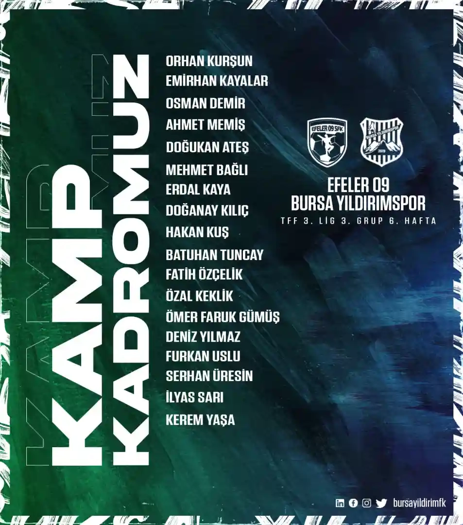 Bursa Yıldırımspor'da Mehmet Kalkan, Fatih Ateş ve Fatih Kılıççı sakatlıkları sebebiyle Aydın'a götürülmedi.