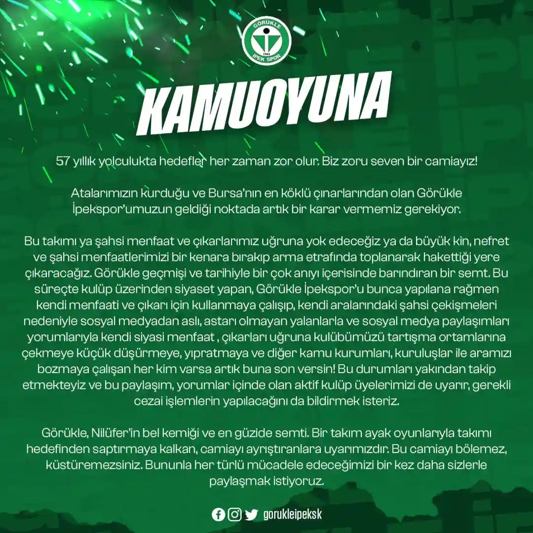 Bu takımı ya şahsi menfaat ve çıkarlarımız uğruna yok edeceğiz ya da büyün kin, nefret ve şahsi menfaatlerimizi bit kenara bırakıp arma etrafında toplanarak hakettiği yere çıkaracağız. Görükle geçmişi ve tarihiyle bir çok anıyı içerisinde barındıran bir semt. Bu süreçte kulüp üzerinden siyaset yapan, Görükle İpekspor’u bunca yapılana rağmen kendi menfaati ve çıkarı için kullanmaya çalışıp, kendi aralarındaki şahsi çekişmeleri nedeniyle sosyal medyadan aslı, astarı olmayan yalanlarla ve sosyal medya paylaşımları yorumlarıyla kendi siyasi menfaat , çıkarları uğruna kulübümüzü tartışma ortamınlarına çekmeye küçük düşürmeye, yıpratmaya ve diğer kamu Kurumları, kuruluşlar ile aramızı bozmaya çalışan her kim varsa artık buna son versin! Bu durumları yakından takip etmekteyiz ve bu paylaşım, yorumlar içinde olan aktif kulüp üyelerimizi de uyarır, gerekli cezai işlemlerin yapılacağını da bildirmek isteriz.