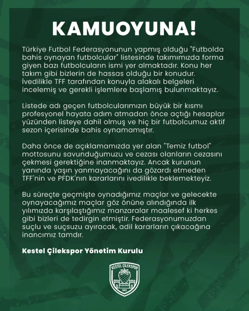 TFF'nin bahis oynayan futbolcular listesine giren oyuncuları olduğunu doğrulayan Kestel Çilekspor Yönetimi, çoğunun aktif sezonda değil, profesyonel hayata girmeden önce açtıkları hesaplar yüzünden listede olduğunu belirterek TFF ve PFDK'dan adil karar beklediklerini duyurdu.