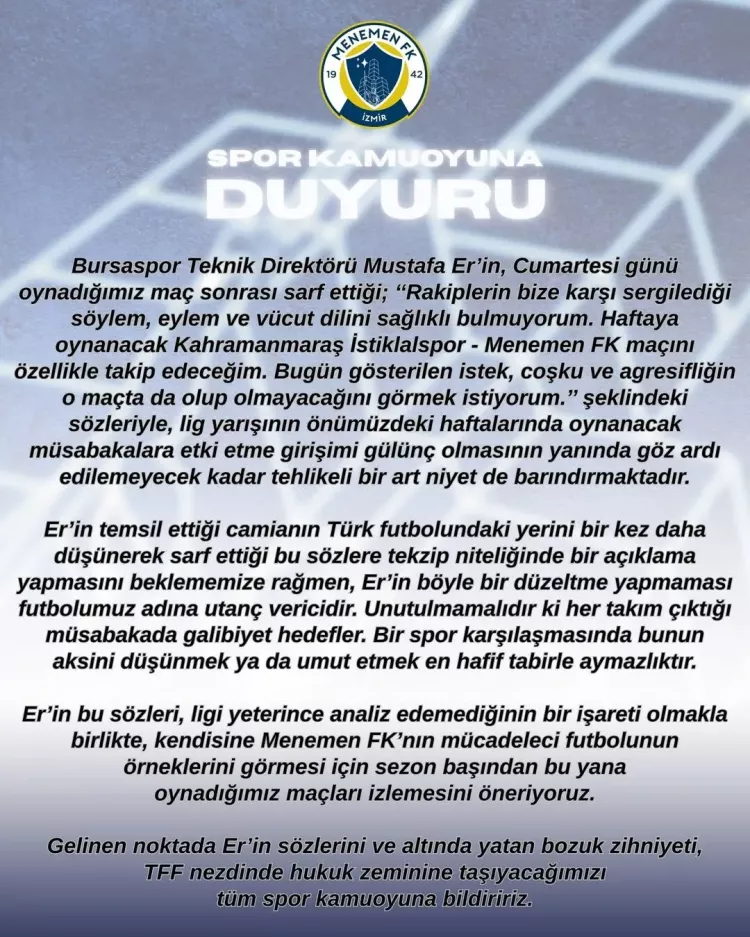 Sarı-lacivertli kulüp, yayımladığı resmi duyuruda Er’in sözlerinin kabul edilemez olduğunu belirtti. Menemen FK tarafından yapılan açıklamada, deneyimli teknik adamın ligde oynanacak karşılaşmalara etki etmeye yönelik ifadeler kullandığı öne sürüldü.