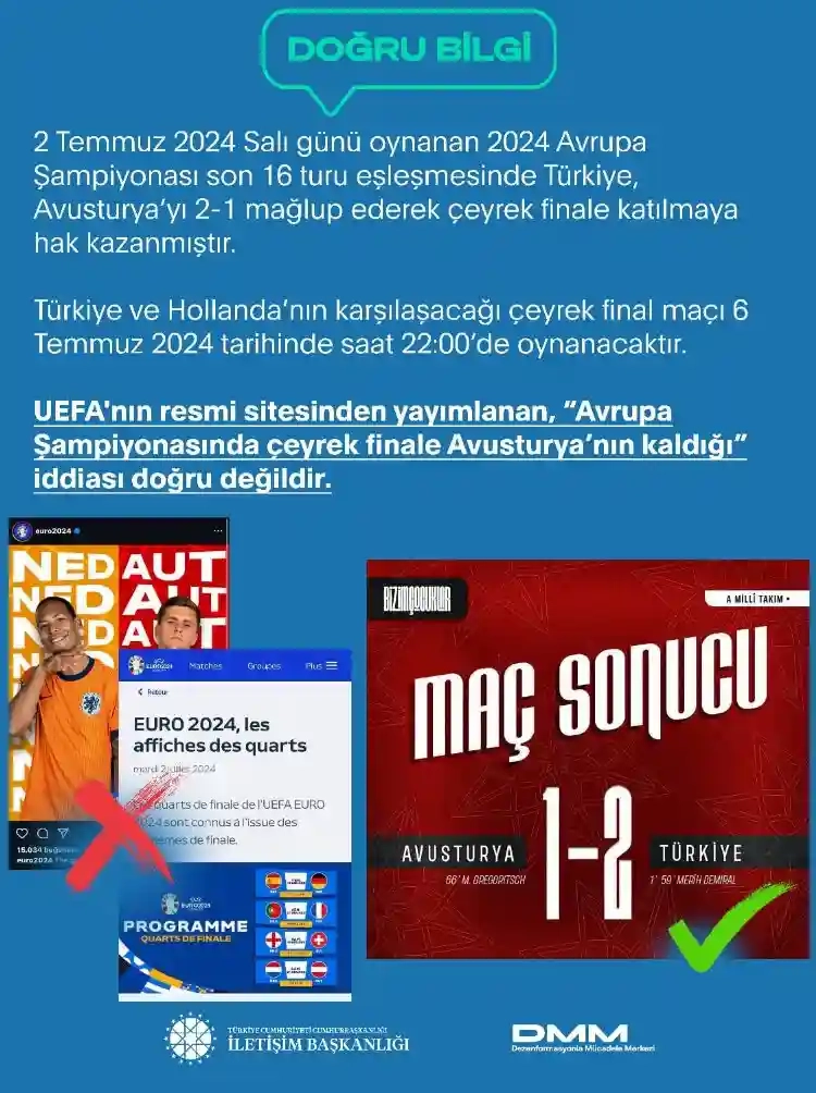 UEFA'nın resmî sitesinden yayımlanan, “Avrupa Şampiyonasında çeyrek finale Avusturya’nın kaldığı” iddiası doğru olmadığının altı çizilen açıklamada, "2 Temmuz 2024 Salı günü oynanan 2024 Avrupa Şampiyonası son 16 turu eşleşmesinde Türkiye, Avusturya’yı 2-1 mağlup ederek çeyrek finale katılmaya hak kazanmıştır. Türkiye ve Hollanda’nın karşılaşacağı çeyrek final maçı 6 Temmuz 2024 tarihinde saat 22:00’de oynanacaktır" ifadeleri yer aldı.