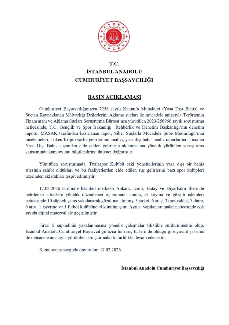 Başsavcılık tarafından yapılan açıklamada, Tuzlaspor Kulübü eski yöneticilerinin yasa dışı bahis sitesi işleticiliği yaptığı ve bu faaliyetlerden elde edilen gelirleri bazı spor kulüpleri üzerinden akladıkları tespit edildiği bildirildi. Soruşturma, T.C. Gençlik ve Spor Bakanlığı Rehberlik ve Denetim Başkanlığı denetim raporu, MASAK raporları, Siber Suçlarla Mücadele Şube Müdürlüğü incelemeleri ve kripto varlık gelir analizleriyle desteklendi.