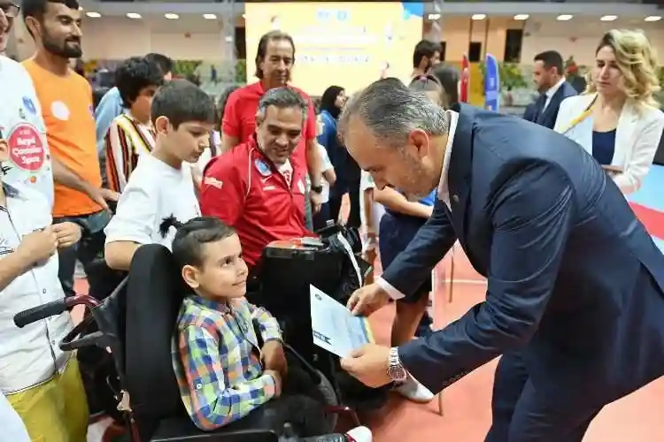 Farklı branşlarda eğitim alan çocukların gösteri maçlarıyla renklenen törende konuşan Büyükşehir Belediye Başkanı Alinur Aktaş, 7’den 70’e herkesin spor ve sanat alanında en az bir branşla profesyonel anlamda ilgilenmesi gerektiğini söyledi. Bu amaçla pek çok etkinliğe imza attıklarını hatırlatan Başkan Aktaş, “10 bin civarında çocuğumuz farklı branşlarda eğitimden geçti. Ayrıca portatif yüzme havuzlarımızda da 6000 civarında çocuğumuz eğitimler aldı, yüzme öğrendi. 111 engelli kardeşimiz 7 branşta eğitim aldılar. Biliyorum hayalleriniz var. Kiminiz mühendis olmak istiyor, kiminiz mimar, kiminiz doktor, kiminiz öğretmen. Hangi eğitim dalında hangi meslekte, sektörde olursanız olun en az bir spor ve sanat dalıyla mutlaka ilgilenin. Memur olsun, bürokrat olsun, yaşlı olsun, genç olsun fark etmez. Herkes en az bir spor ve sanat dalıyla ilgilenmeli. Bizim derdimiz, heyecanımız budur. Bu gördüğüm tablodan, projenin amacına ulaşmış olmasından çok mutlu olduğumu belirtmek istiyorum” dedi.