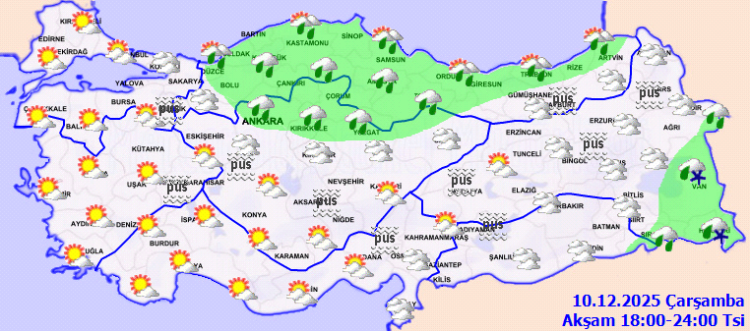 Genellikle yağmur ve sağanak, Doğu Anadolu'nun doğusu ile Sivas çevrelerinde karla karışık yağmur ve kar şeklinde görülmesi beklenen yağışların, Orta ve Doğu Karadeniz kıyılarında yer yer kuvvetli olacağı tahmin ediliyor. Sabah ve gece saatlerinde Marmara'nın doğusu ile iç kesimlerde pus ve yer yer sis, Doğu Anadolu'nun kuzey ve doğusunda buzlanma ve don olayı bekleniyor.